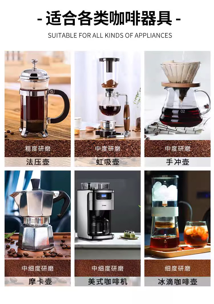 不同粗細的咖啡粉看下圖2就知道哪種喝法用哪種粗細的咖啡粉了。