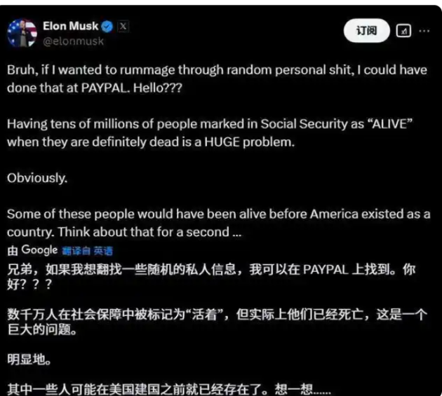首先就是特朗普及其團隊與美聯儲、美國民主黨及背後的Deepstate集團關係日益緊張。眾所周知本次大選特朗普與美聯儲支持的民主黨火藥味十足,特朗普第二屆任期大動作頻繁,已經開始動美聯儲背後的Deepstate集團根基和奶酪的地步。美國剛剛確認了700萬超過120歲的居民“死亡”。大家都覺得這事跟美國的超級富豪馬斯克脱不了干係。報道稱美國效率部已經把大約700萬個登記在冊、年齡超過120歲、被標為“在世”的美國人更新成了“死亡”。