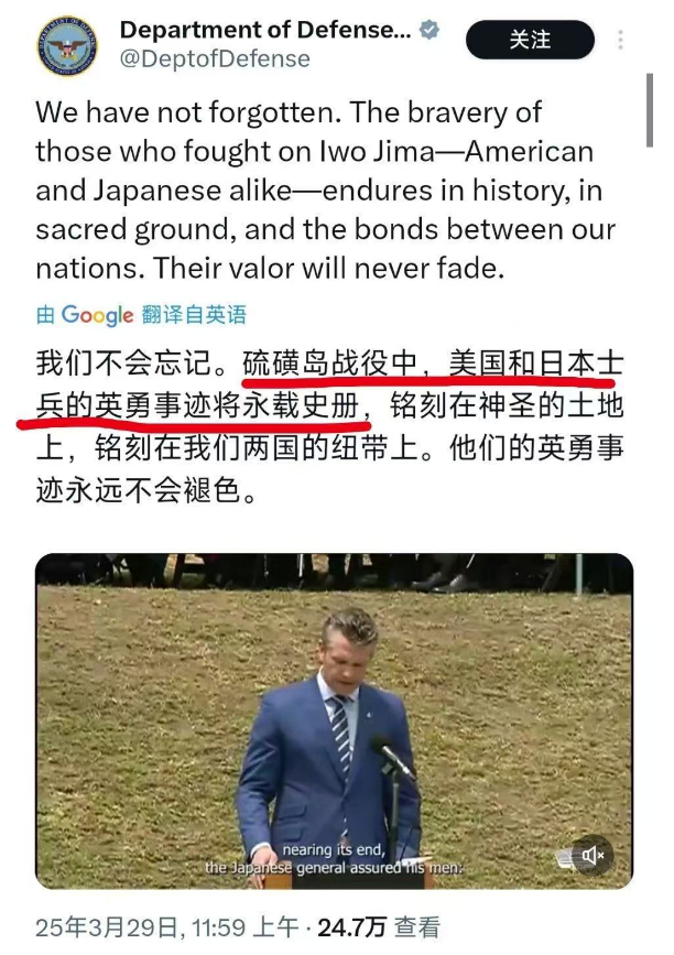 希拉里及美國民主黨一直在攻擊美國防部長皮特·海格塞斯的不專業,不過也難怪海格塞斯雖然曾是陸軍少校,但是這位哥們確實是特朗普政府中最薄弱的一環。剛剛海格塞斯又在關島表示我們不會忘記硫磺島戰役中美國和日本士兵的英勇事蹟,將永載史冊,銘刻在神聖的土地上,銘刻在我們兩國的紐帶上。