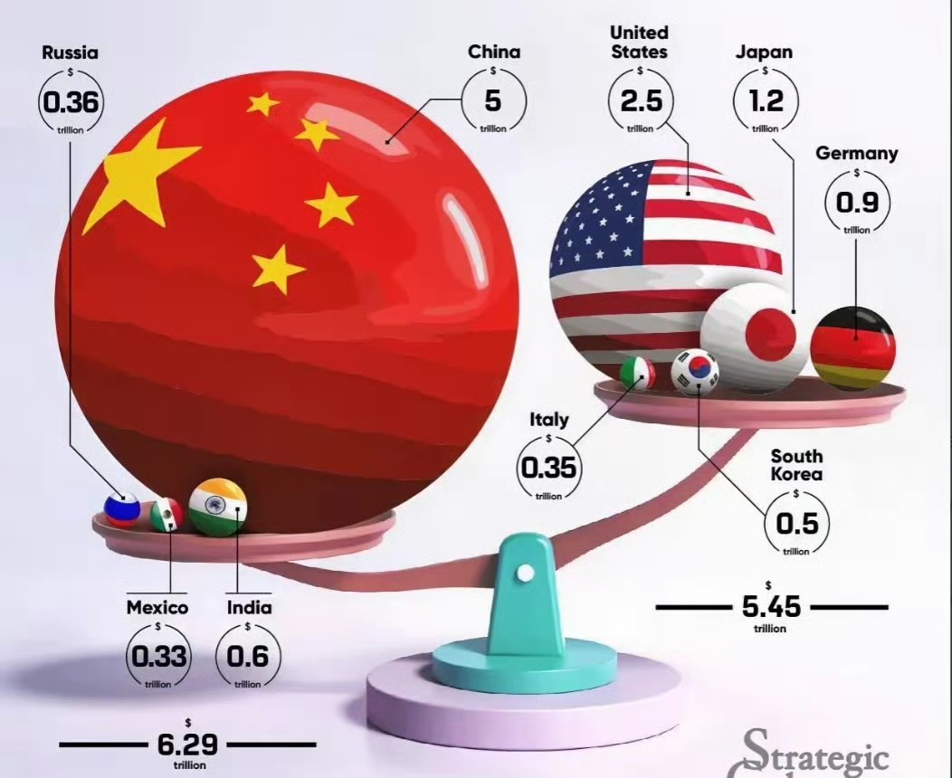 但是如果美元的儲備貨幣地位受到質疑,不能將超發的貨幣散到世界各國,那麼美國現在的通脹就不是10%而是30%了。2020年到2024年四年時間,美國就印了15萬億的美元,相當於咱們三十多年累積的外匯儲備的五倍,相當於四個日本的GDP。