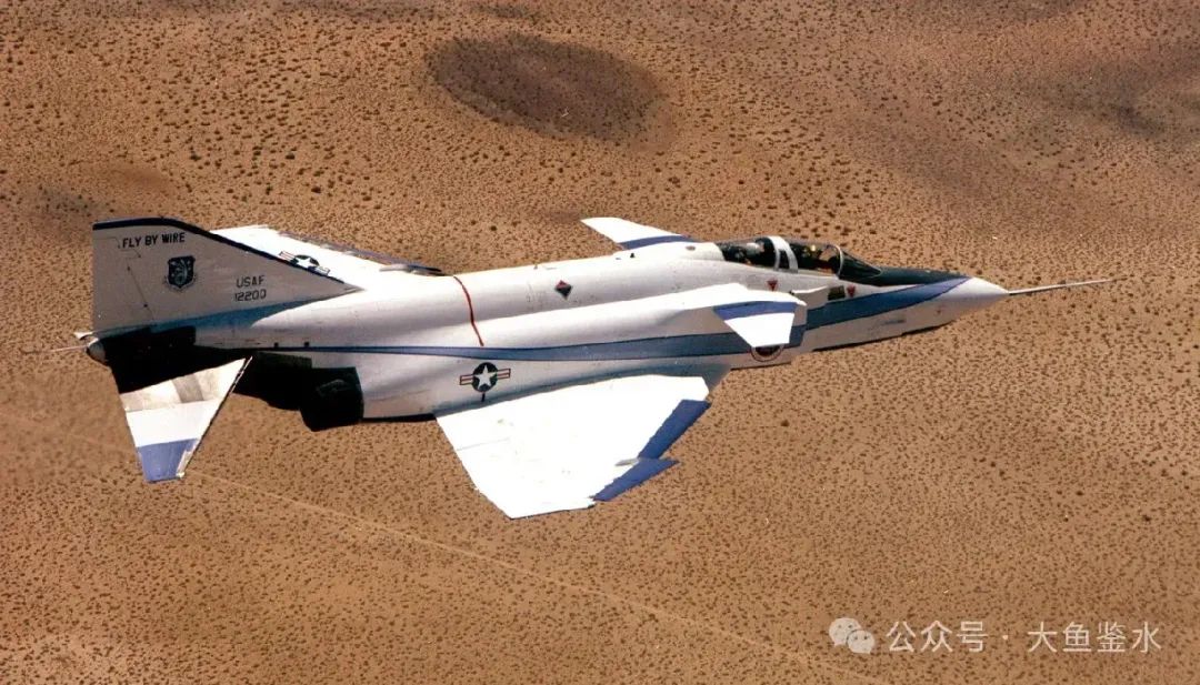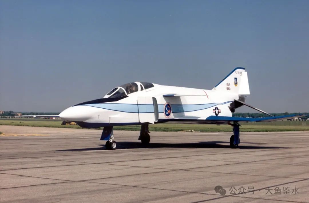 美國航空界也沒有忽視這股潮流,很早就開始戰鬥機應用鴨翼的相關研究。上面這架樣子奇特的F-4是總產量5195架的龐大“鬼怪”家族中非常特殊的一架,它是1962年訂購的YRF-4C偵察型首架原型機(序列號62-12200),1963年8月8日首飛,作為RF-4C的空氣動力學試驗枱。1967年它被改裝為F-4E戰鬥轟炸型的空氣動力學原型機,型號改為YF-4E,先後測試了鈹制方向舵(比標準鋁製方向舵輕34.6%)、固定式前緣縫翼(敏捷鷹 IV計劃)和開槽式水平尾翼。