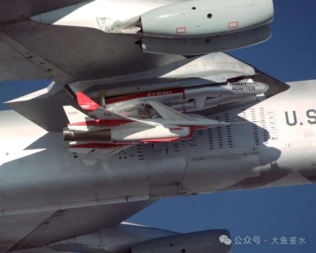 > 通過特殊設計的適配器掛載在NB-52B翼下的HiMAT,這具掛架曾用於發射X-15和其它升力體驗證機