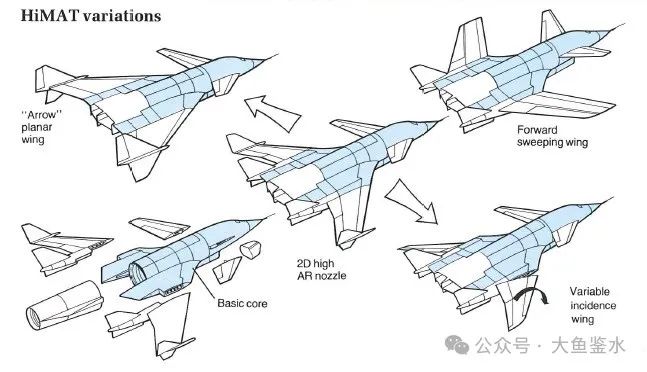 該機的模塊化設計可以通過更換部件組成不同的氣動構型供研究測試,在通用前機身核心部分的基礎上可替換二元矢量噴管、可變仰角機翼(類似北六代的可動翼尖,但整個機翼都能動)、取消尾撐的箭型三角翼以及前掠翼。