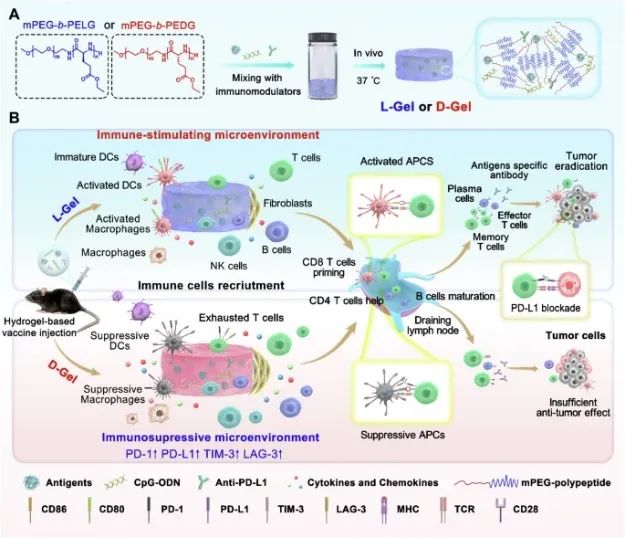 癌症是全球人類健康的主要威脅。目前癌症免疫治療的主流方法包括癌症疫苗、 免疫檢查點阻斷和過繼免疫細胞療法。其中,癌症疫苗在多種腫瘤抗原呈遞後誘導特異性免疫反應,發揮優異的抗腫瘤作用,產生長效保護,防止腫瘤復發。疫苗遞送的病原體相關抗原可以通過多種方式配製,疫苗注射後,抗原呈遞細胞(APC)吸收抗原或其他成分並排流到局部引流淋巴結(LN),在那裏抗原呈遞給B細胞和T細胞以啓動適應性免疫反應。儘管癌症疫苗具有許多突出的特點,但目前的臨牀療效仍然不足。腫瘤抗原的免疫原性、疫苗刺激的持續時間、疫苗成分的遞送效果以及局部注射部位或腫瘤組織的免疫微環境等各種因素都會影響最終的抗腫瘤效果。為了克服這些問題,已經開發了許多策略,包括持續遞送多種疫苗成分、靶向特定免疫細胞或組織或激活APC。傳統的推注疫苗通常無法提供持續的免疫刺激,需要多次加強注射以增強特異性免疫反應。然而,多劑量注射會導致那些獲得醫療保健服務的機會有限的人需要額外的程序,並給接種人羣帶來額外的成本和痛苦。水凝膠作為一種獨特的藥物遞送平台,已被廣泛研究用於各種應用。水凝膠作為藥物遞送系統具有相當大的優勢,特別是對於多種藥物或免疫調節成分的持續、長效遞送,可以模擬多劑量注射。此外,最近的研究證明,水凝膠還可以通過調節機械強度、孔徑大小、降解行為和成分來影響免疫反應的表型。由於免疫細胞浸潤到水凝膠中的內在特徵,基於水凝膠的疫苗可以提供免疫生態位。基於之前對多肽水凝膠作為藥物載體的研究,在此研究利用多肽水凝膠作為癌症疫苗平台的可行性。氨基酸作為多肽的基本單元,具有作為手性對映異構體的獨特特性。最近,手性材料已用於生物醫學應用。事實上,已經使用基於肽的納米疫苗的平台研究了氨基酸手性對免疫反應的影響和超分子寡肽水凝膠。幾種基於D-氨基酸的系統被證明可以通過促進抗原或納米顆粒的內吞作用和炎性細胞因子的分泌來增強抗腫瘤免疫反應。然而,缺乏對具有不同殘基手性的多肽水凝膠疫苗的研究,目前的研究很少關注水凝膠本身引起的局部免疫微環境的影響。此外,水凝膠作為一類宏觀植入材料,可通過調節浸潤免疫細胞的激活狀態,顯著影響注射部位的局部免疫微環境,進而影響其抗腫瘤療效。在之前的工作中,研究表明不同的手性對映異構體導致體內水凝膠降解行為顯着不同;然而,尚未報道對宿主免疫反應的深遠影響。在此,研究設計合成了具有不同手性殘基的甲氧基聚(乙二醇)-多肽(mPEG-多肽)水凝膠,並通過加載抗原和佐劑將其用作癌症疫苗。研究了多肽水凝膠的溶膠-凝膠轉化和體外藥物釋放行為,以確保所有多肽水凝膠表現出相似的性能。體內外降解行為表明,D-氨基酸殘基含量較高的水凝膠降解速度較慢。研究了氨基酸殘基的手性對免疫細胞募集的影響。隨後分析了水凝膠中募集的免疫細胞的表型,以展示免疫細胞的活化狀態和局部免疫微環境。通過負載特異性抗原和佐劑製備以手性多肽水凝膠為基礎的腫瘤疫苗。在預防和術後復發小鼠模型中評估水凝膠疫苗對抗腫瘤免疫應答和腫瘤抑制效率的影響。研究發現,基於L-或D-氨基酸殘基的多肽水凝膠通過調節局部免疫微環境誘導了明顯不同的抗腫瘤免疫反應。