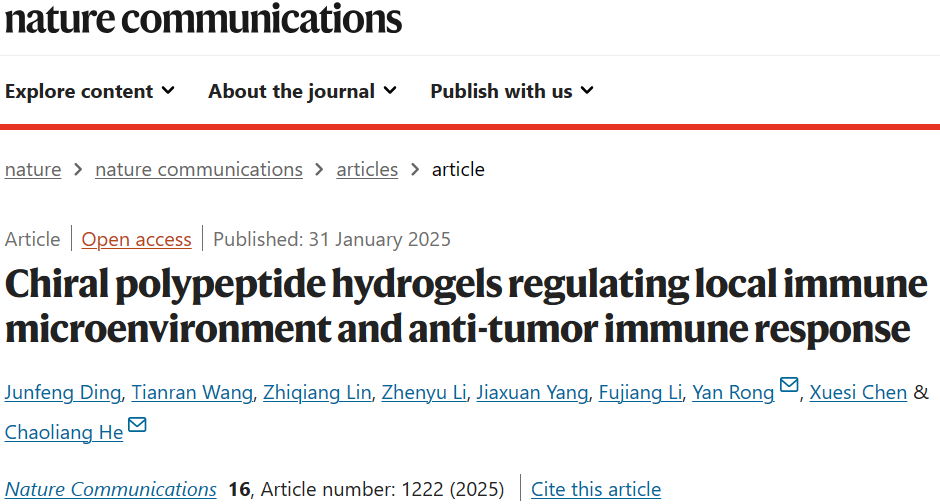 2025年1月31日,中國科學院長春應用化學研究所賀超良、榮巖共同通訊在Nature communications 上在線發表題為“Chiral polypeptide hydrogels regulating local immune microenvironment and anti-tumor immune response”的研究論文。研究展示了多肽水凝膠的殘基手性在抗腫瘤免疫和局部免疫微環境調節中的關鍵作用。