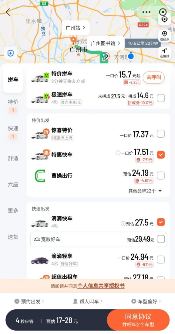 以廣州圖書館至廣州火車站為例,高德地圖提供的經濟型最低價僅需13元,而滴滴即使是特價拼車方案,一口價也要15.7元起。