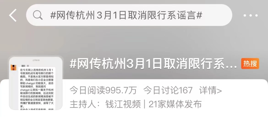 隨後“江浙之聲”報道,這則所謂的“新聞”,是杭州某小區業主羣討論ChatGPT,一位業主開玩笑,稱試試用ChatGPT寫“杭州取消限行”的“新聞”,並在羣裏直播ChatGPT寫作的全過程,其他看到文章的業主直接當成新聞截圖轉發。
