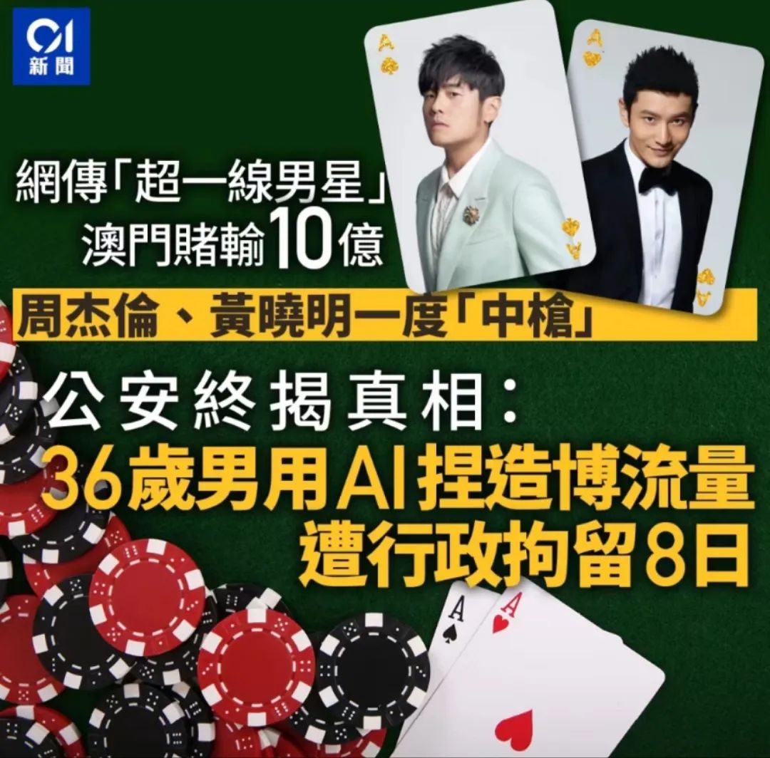 “頂流男星豪賭10億”就來自某網友手筆,該網友使用AI軟件輸入社會熱點詞,製作了標題為‘頂流明星被曝境外豪賭輸光十億身價引發輿論海嘯’的謠言信息,並在小紅書、微博等社交平台迅速擴散,目前已被處以行政拘留8日處罰。