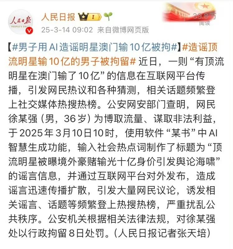 公安部通告稱,“網民徐某強(男,36歲)為博取流量、謀取非法利益,於2025年3月10日10時,使用軟件“某書”中AI智慧生成功能,輸入社會熱點詞製作了標題為‘頂流明星被曝境外豪賭輸光十億身價引發輿論海嘯’的謠言,公安機關根據相關法律法規,已對徐某強處以行政拘留8日處罰。”