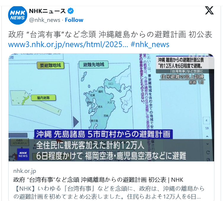 日本放送協會(NHK)和共同網的報道,日本政府為11萬名來自沖繩縣先島羣島(Sakishima)的居民和在當地1萬名的旅客制定應急計劃。按照該計劃,在台灣出現緊急事態時這12萬名居民將能迅速撤離,日本政府會派出自衞隊、海上保安廳的船隻,以及民間船隻和飛機,確保1日能夠疏散2萬人的運力。