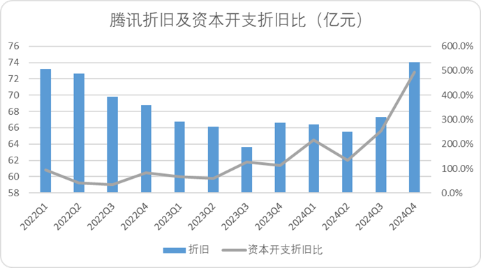 同時,雖然業績會中騰訊的高管花了大量的篇幅來安撫投資者資本開支並不會大幅度抬升折舊費用,但從實際的表現來看,還是2024Q4折舊率的提升還是非常明顯。