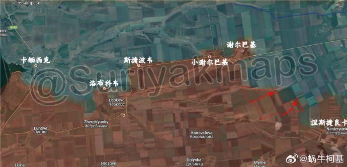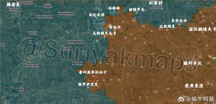 1、德沃裏奇納:俄軍收復了扎帕德內以西的失地。此外,還在德沃裏奇納西南取得了新的進展。