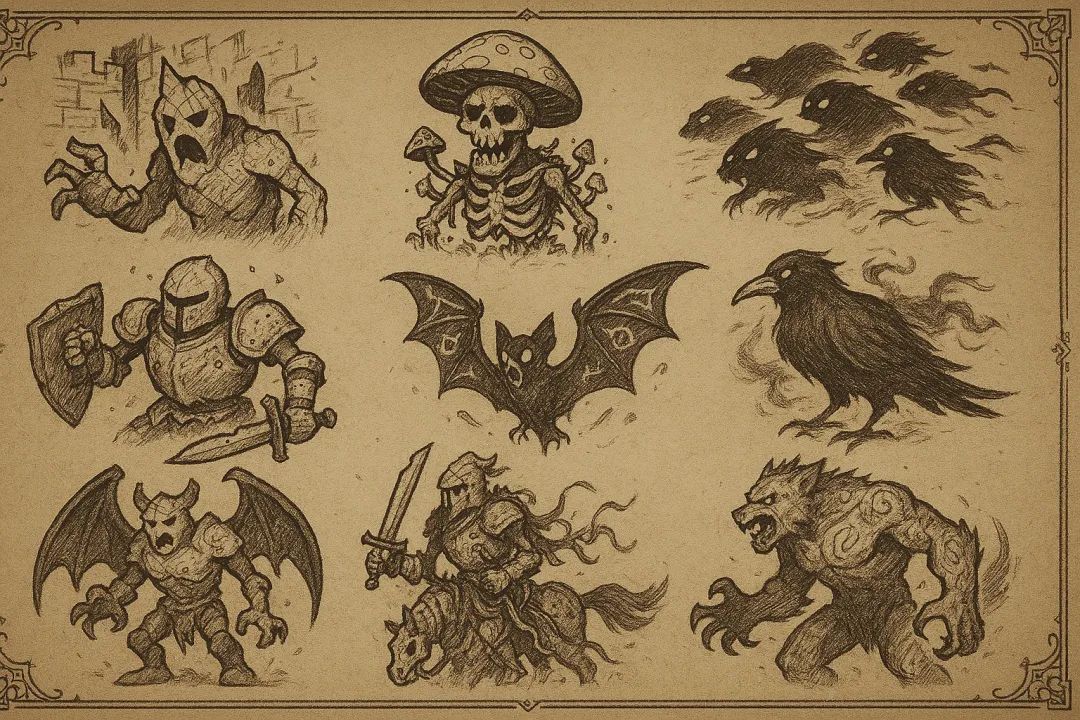 請生成一個遊戲頁面( 怪物圖譜 )展示這些怪物的簡筆畫,注意頁面排布美觀整齊,怪物特徵和頁面風格要符合中世紀 RPG 的世界觀。