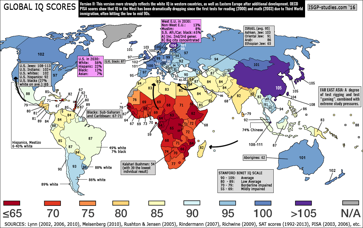 首先,是位於起源地附近的各國,智商相對較低,基本位於80以下。