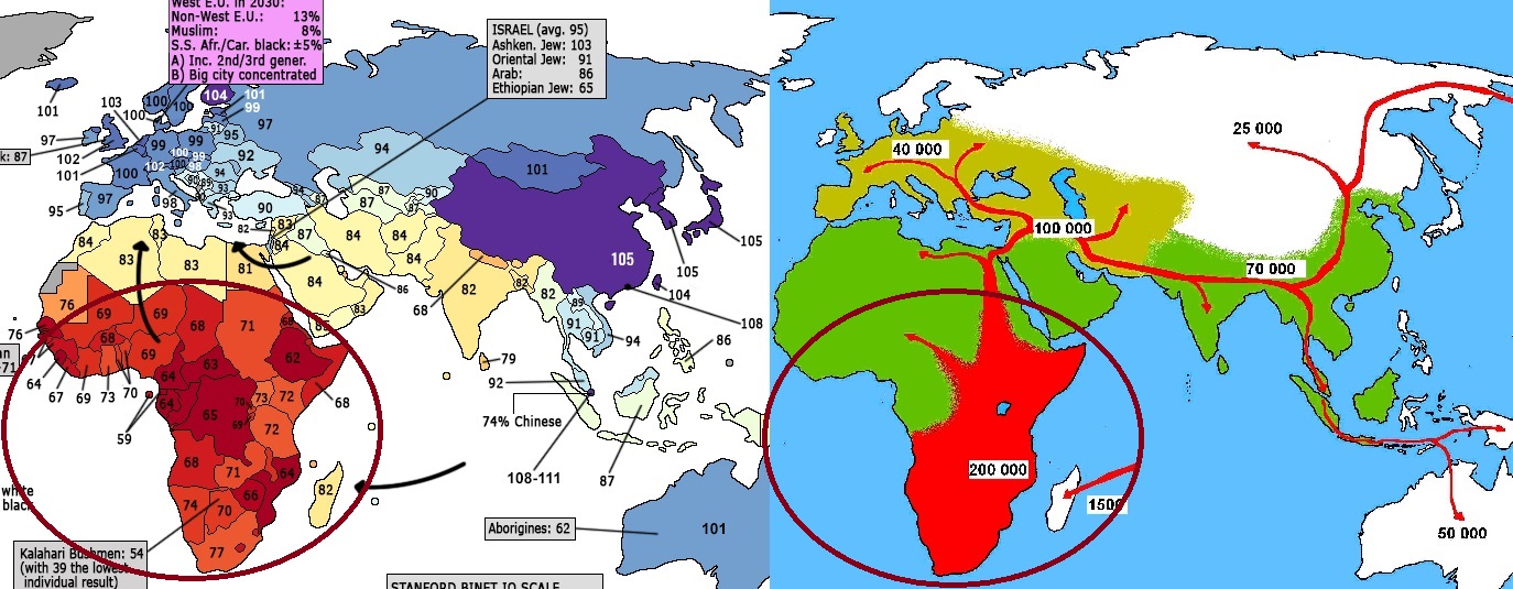 兩張圖一對比,你會發現很有意思的一點:各國的平均智商,似乎與非洲起源説的遷徙路線達成了某種統一。