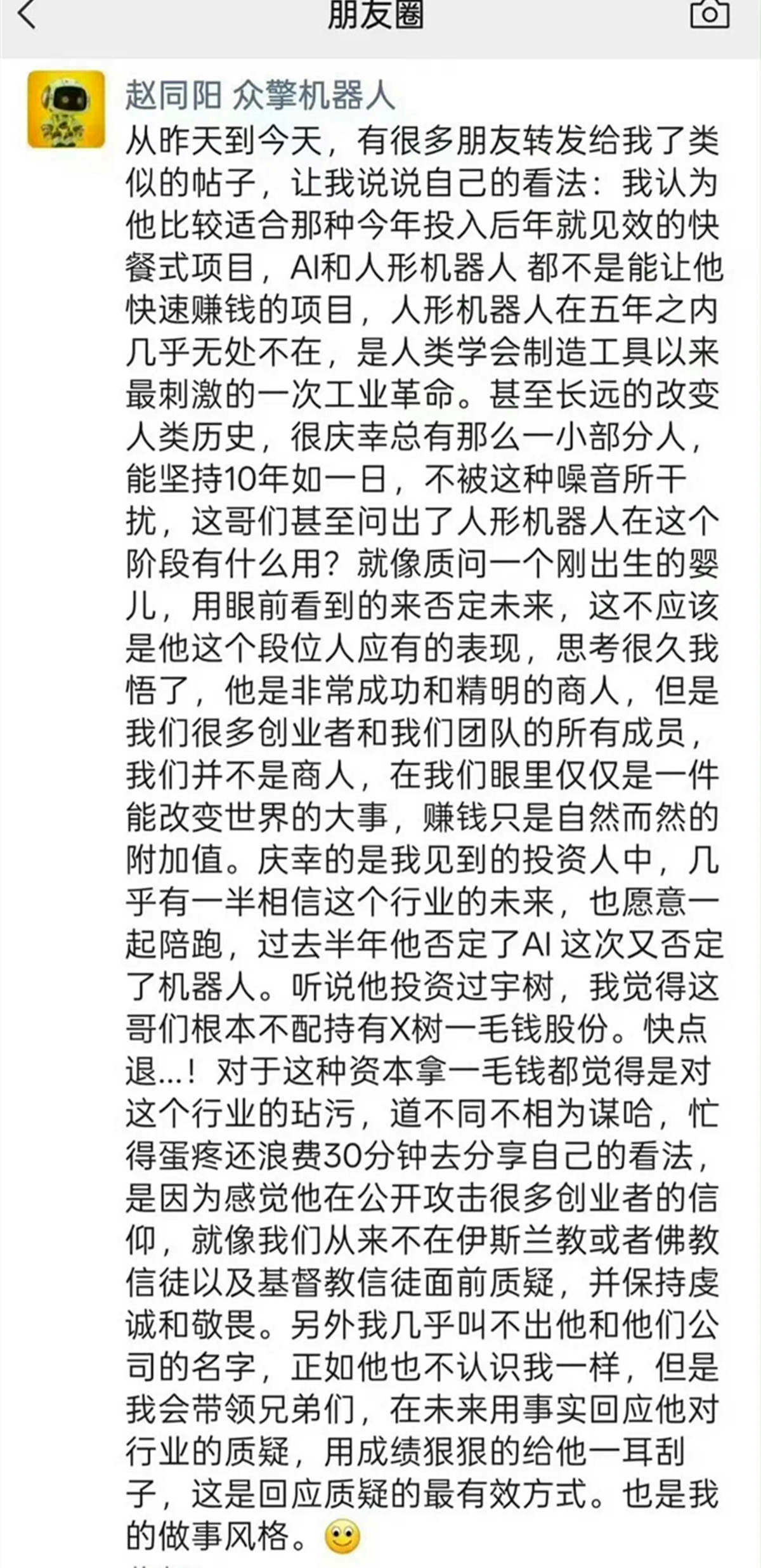 從上述這些數據不難看出,朱嘯虎在機器人領域的投資規模極小,可謂“投了幾兩蚊子肉”,且很快便選擇撤資。但令人不解的是,撤資後他不僅沒有對這個行業保持基本尊重,反而公開唱衰,踩上一腳再吐一口吐沫,有點不地道了。前 IDG 資本投資人指出,在機器人這樣熱門的賽道,投資不到一年就離場,僅憑朱嘯虎説的“對投資人負責”這個理由是很難站得住腳的。投資和撤資本是正常的商業決策,但朱嘯虎撤資後的詆譭行為,已遠超商業決策範疇,反映出個人品德和道德修養問題。