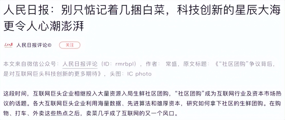 在2020年社區團購大戰火熱之際,人民日報就曾發文提醒,互聯網巨頭理應在科技創新上有更多擔當和追求,而不是隻惦記着幾捆白菜、幾斤水果的流量。
