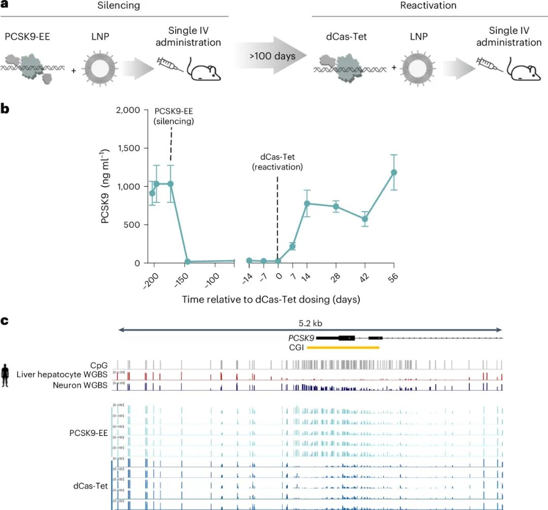 科學家進一步在實驗中探討了這一技術的可逆性。他們利用另一種表觀遺傳激活工具,通過清除PCSK9基因啓動子上的甲基化,重新激活了PCSK9基因的表達。結果發現,基因表達被完全恢復,LDL-C水平也逐步回升至基線。這一發現證明了這種基因編輯技術不僅高效,而且具有可逆性,解決了基因編輯持久性安全性的部分疑慮。