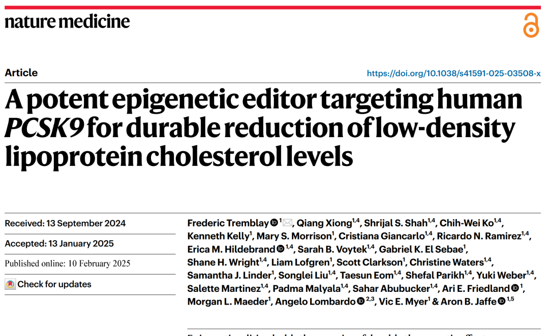 Tremblay, F., Xiong, Q., Shah, S. S., et al. (2025). A potent epigenetic editor targeting human PCSK9 for durable reduction of low-density lipoprotein cholesterol levels. Nature Medicine.