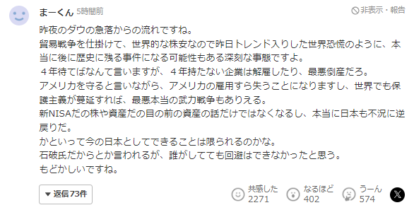 這是從昨晚道指暴跌開始的連鎖反應。掀起貿易戰,引發全球股市暴跌,就像昨天上熱搜的“世界大蕭條”,説不定這真會成為載入歷史的重大事件,事態非常嚴重。有人説“等四年就好”,可問題是,很多企業根本撐不到四年,不是裁員就是最壞的情況——倒閉。口口聲聲説是“為了保護美國”,可到頭來連美國的就業都保不住。如果保護主義在世界範圍蔓延,最壞的情況甚至有可能引發真正的戰爭。這已經不是“新NISA啊、股票啊、資產啊”這些眼前財富的問題了,日本也真的可能會重新陷入經濟衰退。不過話説回來,以現在的日本,能做的事情恐怕也很有限吧。有人説“要是石破來當首相就好了”,但不管是誰當首相,這次恐怕都無法迴避。真是讓人無奈啊。