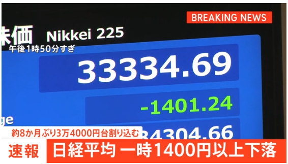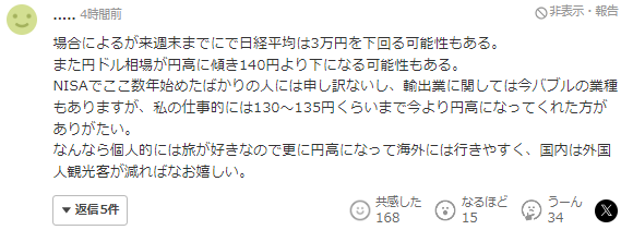 雖然還要看情況,但日經平均指數在下週末之前跌破3萬點的可能性也是存在的。另外,美元兑日元的匯率也可能繼續朝着日元升值的方向發展,跌破140,甚至有可能跌到更低。對那些這幾年剛剛開始通過NISA投資的人來説,真的感到抱歉。雖然對於出口行業來説,現在的匯率反而是一種“泡沫期”利好,但就我自己的工作來説,匯率如果能升值到130~135日元左右反而更理想。説實話,作為一個喜歡旅行的人,日元升值讓我更容易出國旅遊,如果因為這樣國內的外國遊客變少了,我甚至會更開心。