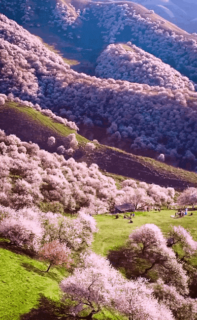 伊犁河谷的杏花更是別具風情。綿延數十里的花海,像一條粉色的絲帶纏繞在青山綠水之間。