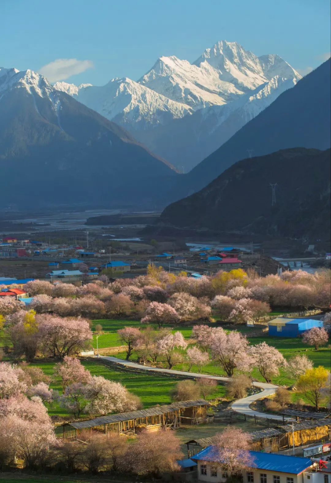 遠處的雪山巍峨聳立,與近處的花海形成鮮明對比,構成了一幅壯美的山水畫卷。杏花在清明時節的綻放,不僅是大自然的饋贈,更是生命的象徵。