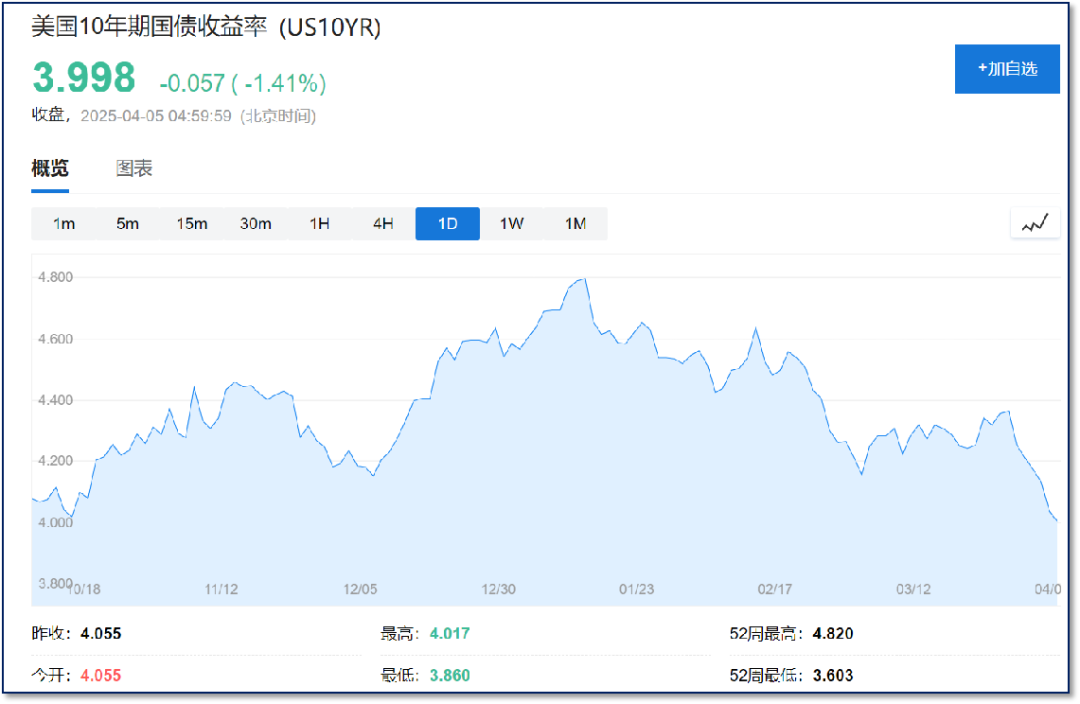 過去被稱之為世界資產定價之錨的10年期美債,自特朗普上台後,已經連續下跌,在4月4日已經跌破4%。