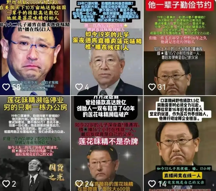 不過這次是反向造謠:蓮花味精瀕臨破產,只剩下一棟辦公樓,老闆兒子含淚直播,僅1人觀看。