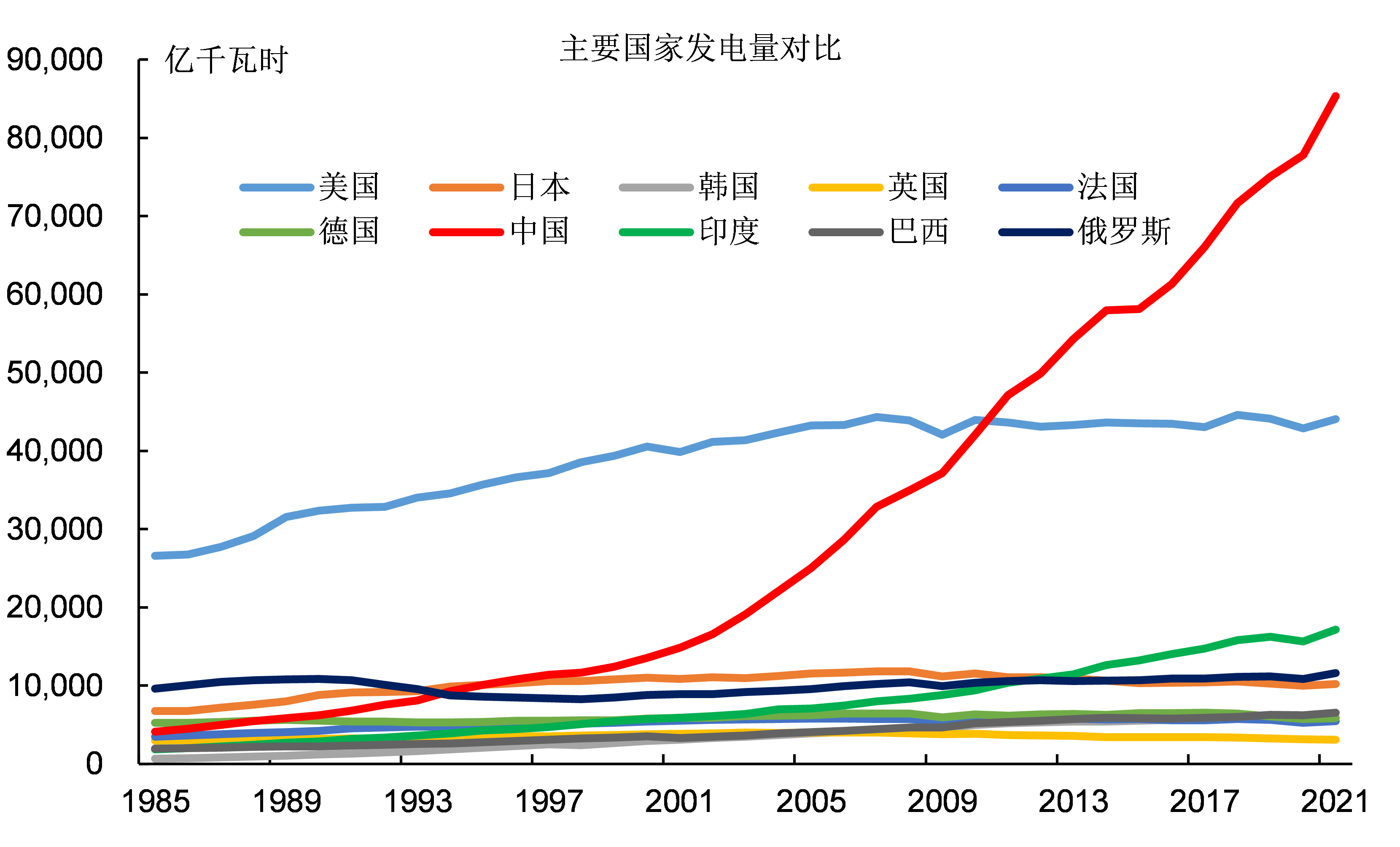 發電量是國家硬實力最有代表性的指標,2023年發電量在10000億千瓦時以上的國家僅有5個,分別是中國、美國、印度、日本和俄羅斯,這些國家無一例外都是當今世界上國家綜合實力最強的國家。