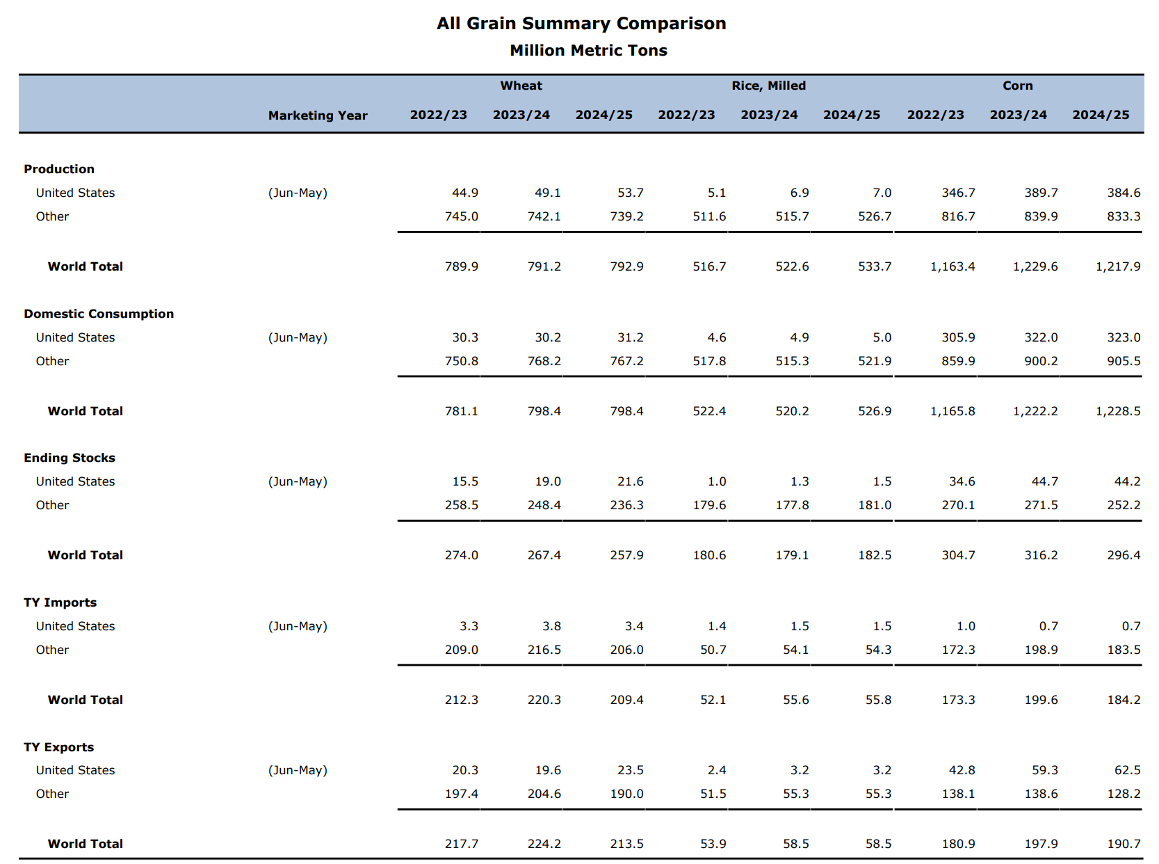 根據美國農業部的數據,2024年美國小麥、水稻和玉米的產量分別是0.54億噸、700萬噸和3.85億噸,分別佔全球總產量的6.8%,1.3%和31.6%。