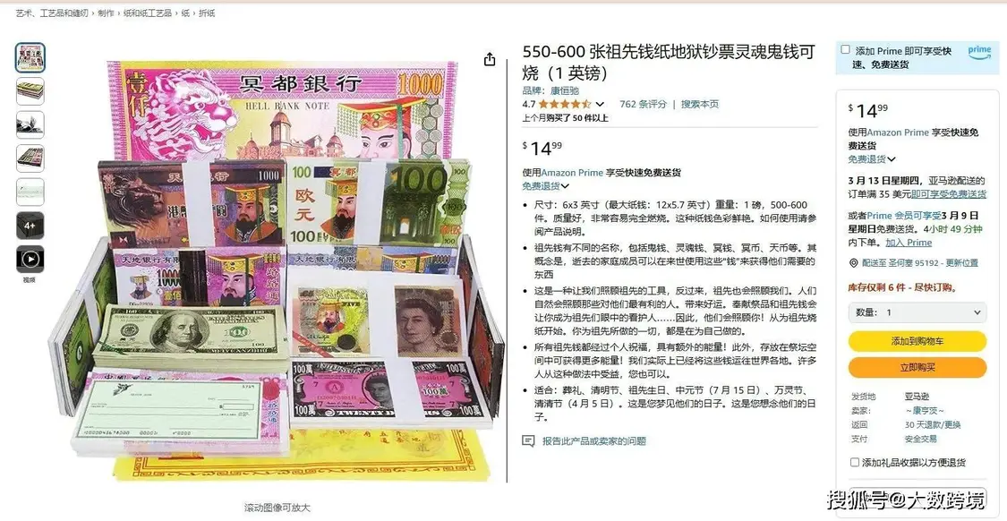 美國亞馬遜上售賣的冥幣 圖源:亞馬遜官網