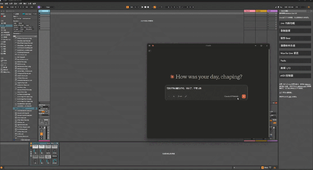 我直接跟它説: “ 給我寫首歌,不需要貝斯。 ” ( 對不起,因為它寫出來的貝斯實在太難聽了。。 ) AI 哥直接連上 Ableton ,就開始創建音軌、設置 bpm 、調整音色,編出了一段曲子,兩個音軌,一個是鋼琴,一個是提琴。你還別説,味道還挺對的。