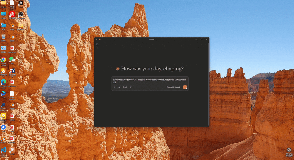 咱先從簡單的開始,我直接告訴 Claude :在我的桌面生成一份 PDF 文件,裏面包含 1980 年各國的 GDP 排名的數據表格,幷包含兩張柱狀圖。