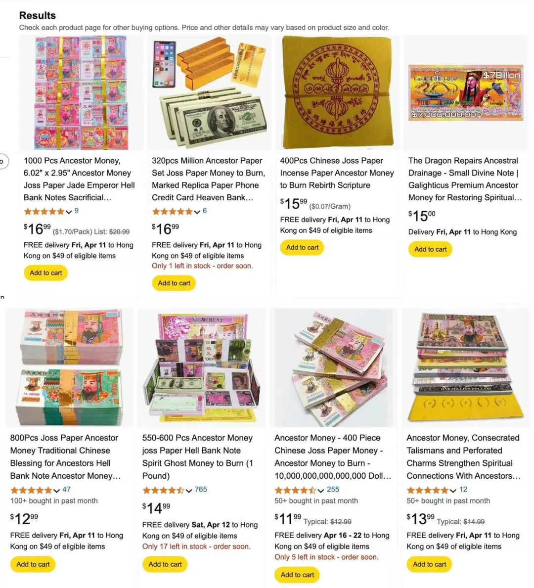 通過在亞馬遜等國際電商平台上搜索“ancestor money”你就能發現,冥幣不僅在俄羅斯、美國、印度尼西亞等國家暢銷,並且標價高的離譜,成本可能不到5元的冥幣,到了這兒標價竟然高達 16.99 美元(差不多 124 元人民幣),活脱脱地變成了奢侈品。
