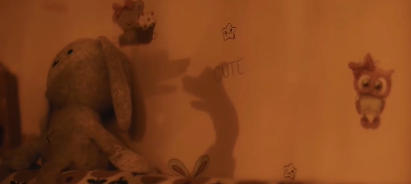 跟電影相同,短片裏也有比手影的場景,但更多的是通過兩隻狗的互相撕咬,具象化她的內心掙扎。