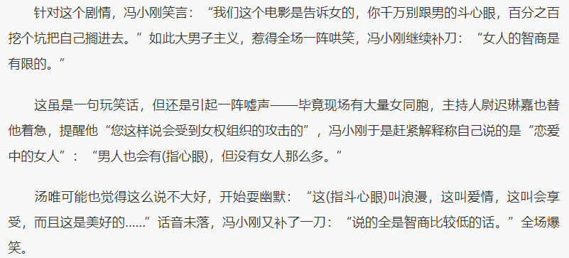 2015年,在《命中註定》的發佈會上,馮小剛説,“女人的智商是有限的,我們這個電影就是告訴女的,千萬別跟男的鬥心眼。”