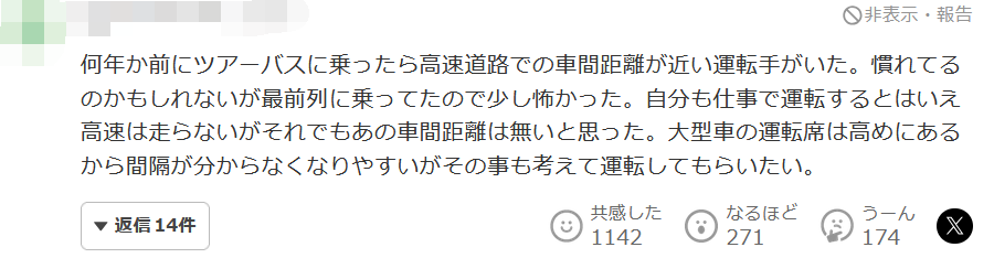 幾年前,我坐過一輛旅遊大巴,高速公路上有個司機車距很近。雖然可能習慣了,但因為坐在最前排,所以有點害怕。雖然自己也開車工作,但高速上不會跑,但還是覺得那個車距不夠。大型車的駕駛席位較高,所以容易分不清間隔,但請您考慮這一點。