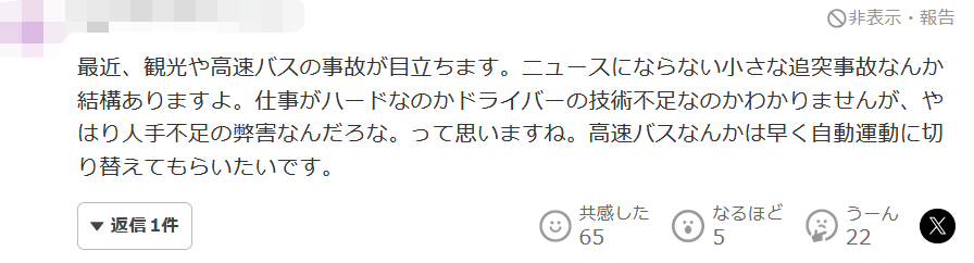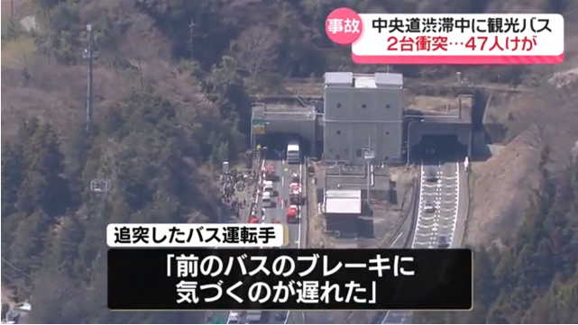 最近,旅遊和高速巴士的事故很突出。有很多小追尾事故不會成為新聞。不知道是工作辛苦還是司機技術不足,不過還是人手不足的弊病吧。希望高速巴士能儘快切換到自動運動模式。