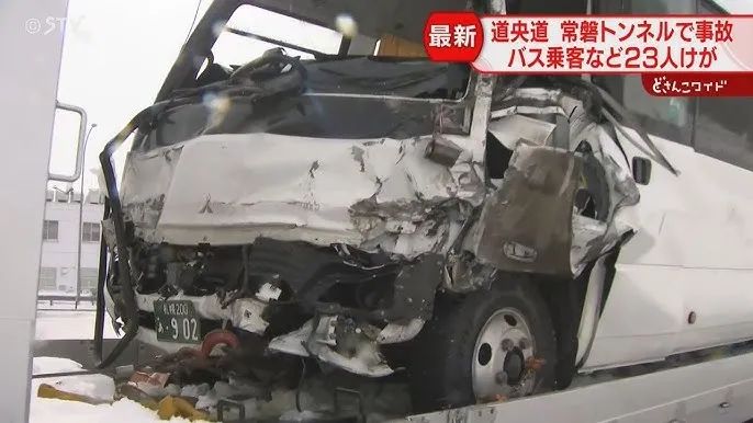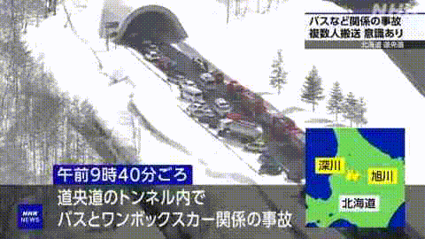 就在前不久,3月31日上午9時40分左右,位於日本北海道旭川市與深川市交界的道央自動車道常磐隧道內,一輛載有20多名亞洲遊客的觀光巴士與一輛豐田海獅麪包車就發生了猛烈碰撞,導致巴士側翻。