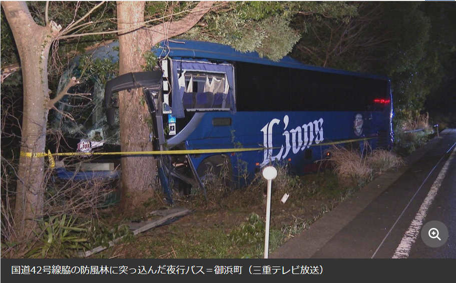 3月22日,日本一輛執行和歌山縣至埼玉縣夜間線路的班車也在行駛時衝出道路撞上大樹,事故導致司機死亡、21名乘客受傷。