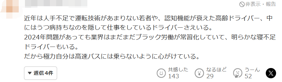 近年來,由於人手不足,駕駛技術不足的年輕人、認知功能下降的老年司機,甚至還有一些司機隱瞞自己患有抑鬱症。2024年,行業仍舊是黑工常態化,還有明顯睡眠不足的司機。所以我儘量不坐高速巴士。