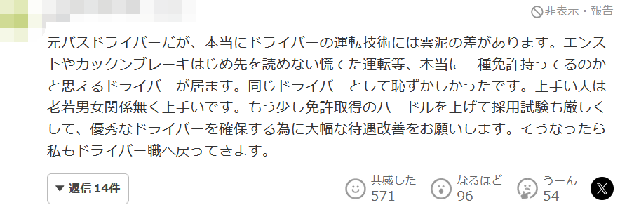 雖然是一名老司機,但司機的駕駛技術真的相差甚遠。有些駕駛員因為急剎車、剎車等無法讀懂方向的匆忙駕駛,真的讓我懷疑他是否真的擁有普通二類機動車駕駛許可。同樣作為司機,我感到很羞愧。好手不分男女老幼,都是好手。請進一步提高取得駕照的門檻,嚴格聘用考試,以確保優秀駕駛員,大幅改善待遇。如果那樣的話,我也會回到司機崗位。