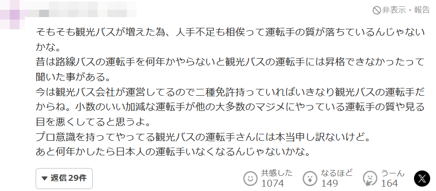 首先,由於觀光巴士的增加,人手不足也導致了司機素質的下降。以前聽説過要當公交司機幾年才能晉升為觀光巴士司機。現在由觀光巴士公司運營,所以只要持有兩種駕照,就可以立即成為觀光巴士的司機。我覺得少數的魯莽司機會破壞其他大多數認真做的司機的質量和眼光。對有專業意識的觀光巴士司機真的很抱歉。再過幾年,日本人的司機可能就不存在了。