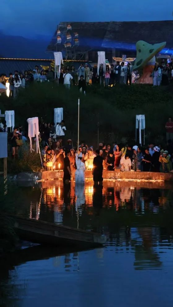 這是一個互動型的裝置,現場的人在小紙船上寫下寄語,將它放在水面上朝紙紮飄去。