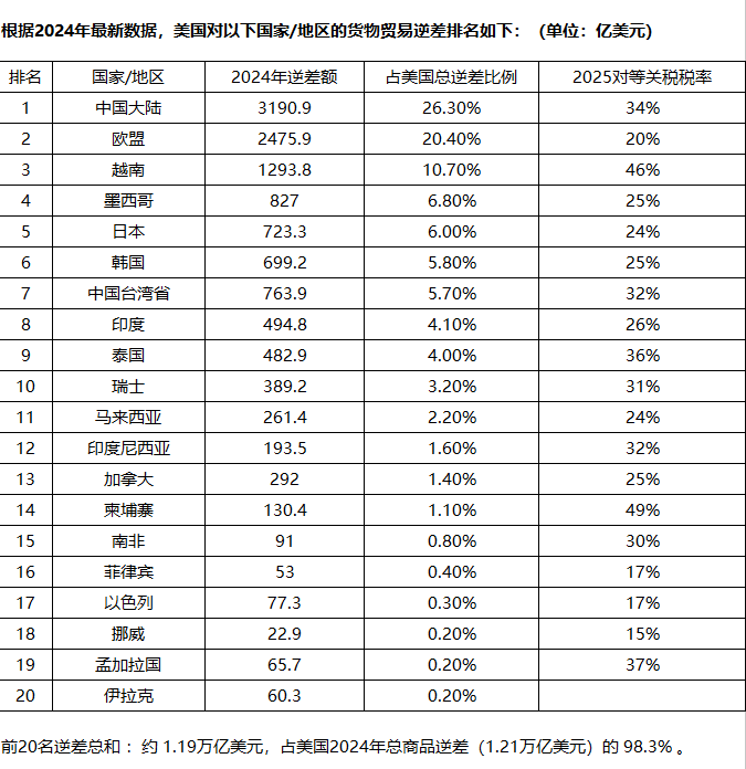 目前印度和越南已經屈服了,準備“減税”也就是減少貿易逆差。對於大多數國家來説,減少貿易逆差並不是什麼難受的事兒,畢竟美國要科技有科技,要農產品有農產品,要武器有武器,多買點兒美國的糧食,多買幾架美國軍機,不就平衡了嗎?2024年歐盟軍費支出是8000億歐元,對美貿易順差是2476億美元,多支出一點兒,平衡這點兒順差那是小意思。下圖中列出了2024年對美貿易順差的國家排名: