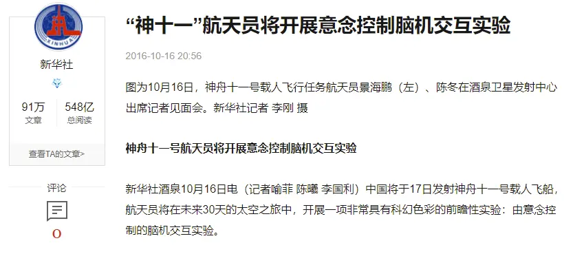 2016年的時候,國防科大也突破了腦機接口技術,並用非侵入式腦機設備,讓神舟十一號航天員展開腦機交互實驗。