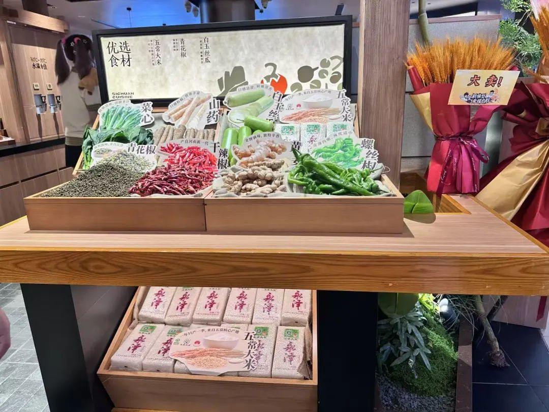 店門口位置也精心設置了食材展示架,將各類食材一一陳列,並詳細標註產地與特色。比如青花椒來自江津;幹辣椒產自河南新一代;螺絲椒皮薄肉嫩,辣度適中;白玉絲瓜口感清甜,鮮嫩清香……