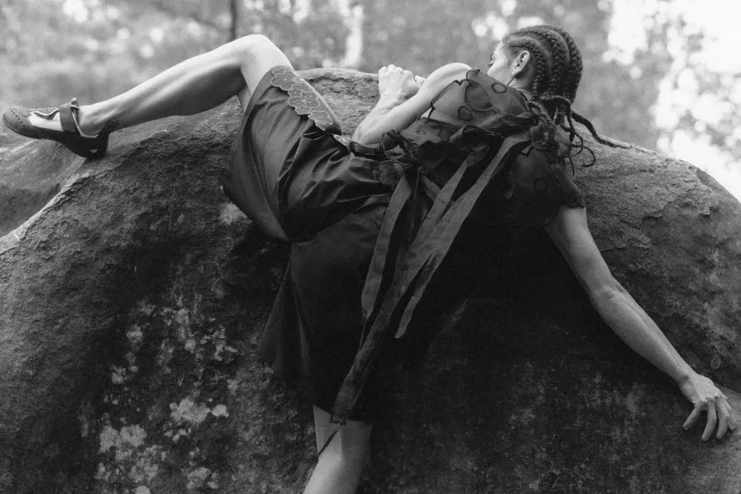 短片中的三位女性皆為職業攀巖運動員,她們打破了户外運動在裝備層面的認知邊界,身着薄紗裙裝穿越岩石裂隙、攀爬峭壁,通過芭蕾般的肢體舒展與舞劇般的鏡頭和配樂,消解了户外嚴酷環境與高級時裝間的隔閡。