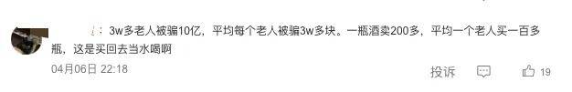 當然,網友們就不淡定了:3w多老人被騙10億,平均每個老人被騙3w多塊。一瓶酒賣200多,平均一個老人買一百多瓶,這是買回去當水喝啊